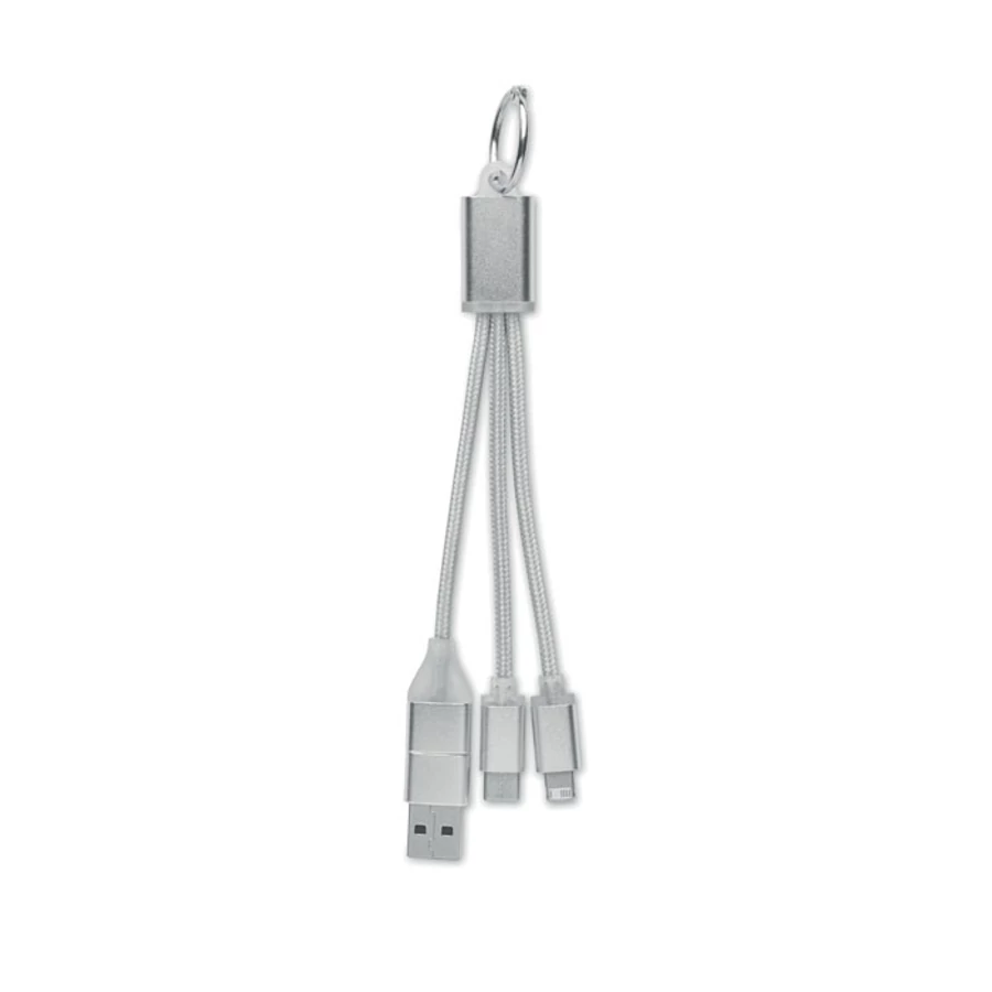 Kulcstartó töltőkábellel. 2 az 1-ben C-típusú, USB-A és mikro USB-B bemenettel és C-típusú kimenettel.