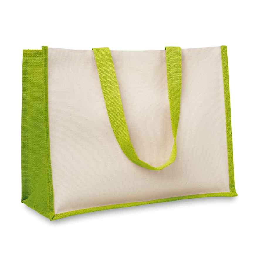 Laminált juta bevásárlótáska. Vászon elülső rész és hosszú, pamut fül.