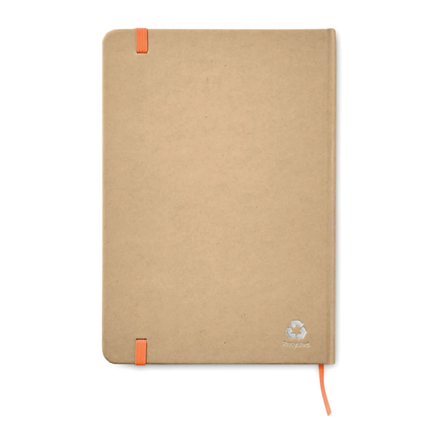 A5 jegyzetfüzet újrahasznosított karton keménytáblás borítóval. Cérnafűzött. 160 vonalas oldal (80 lap) újrahasznosított papírból. Elasztikus zárópánt, könyvjelző szalag.