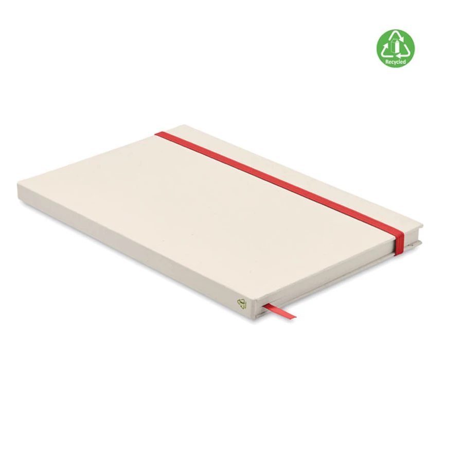 A5 keménytáblás jegyzetfüzet, 160 vonalas oldallal (80 lappal), 80 g vastag, 70%-ban újrahasznosított tejesdoboz csomagolásból és 30%-ban újrahasznosított papírból. Cérnafűzött. Elasztikus zárópánt, könyvjelző szalag.