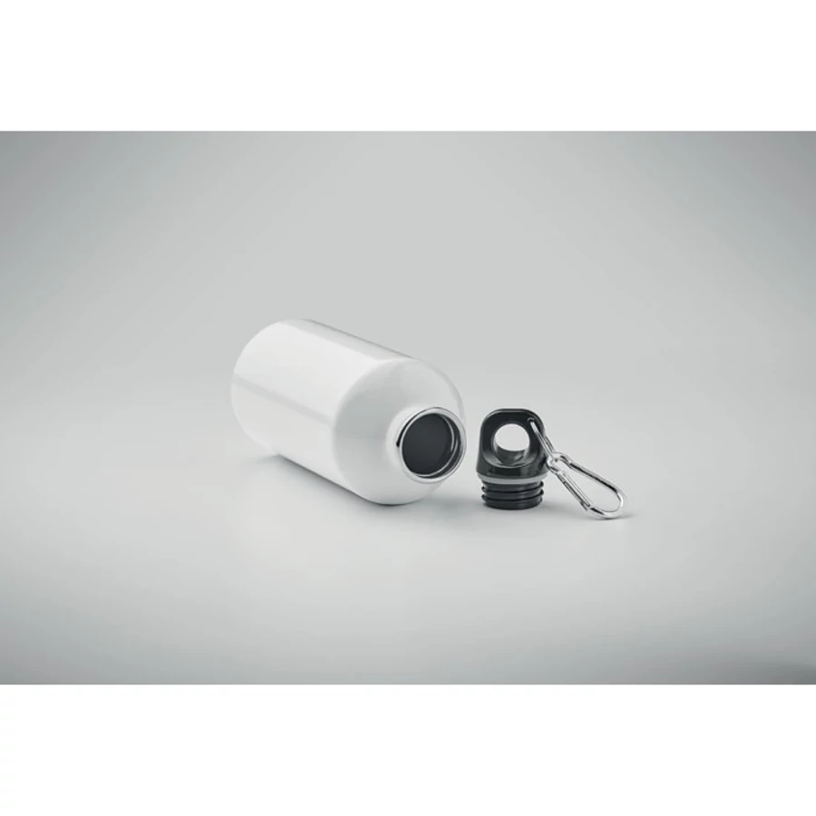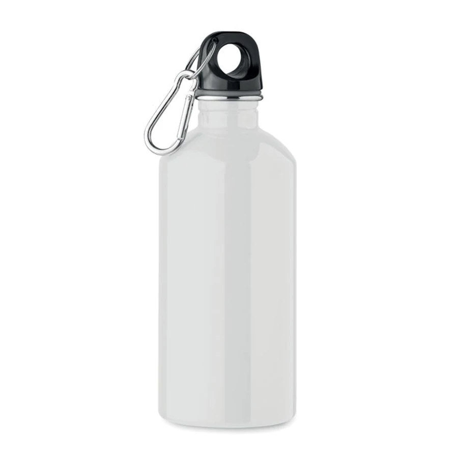 Szimplafalú palack újrahasznosított rozsdamentes acélból (90% újrahasznosított rozsdamentes acél és 10% rozsdamentes acél), karabinerrel. 500 ml. A szublimációs nyomtatás csak a fehér színű terméken érhető el. Szivárgásmentes.