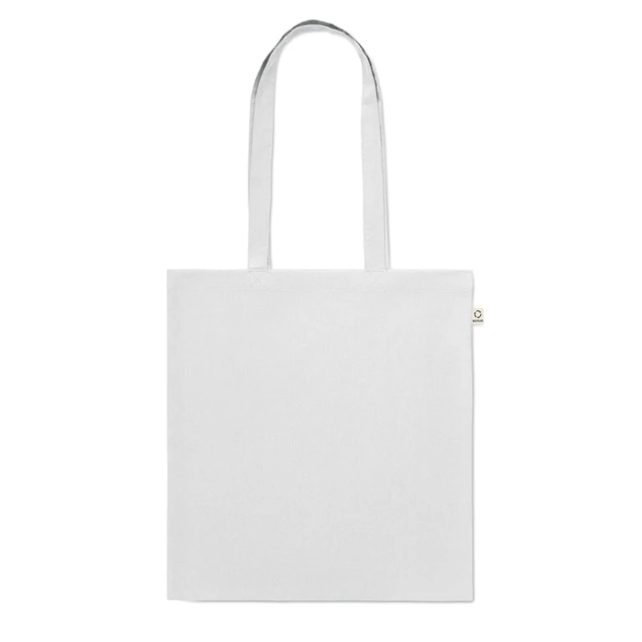 Fogyasztás előtti újrahasznosított pamut bevásárlótáska (70% újrahasznosított pamut és 30% RPET), hosszú fülekkel. 140 g/m². Ez az anyag nyomtatás után zsugorodhat.