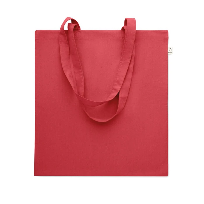 Fogyasztás előtti újrahasznosított pamut bevásárlótáska (70% újrahasznosított pamut és 30% RPET), hosszú fülekkel. 140 g/m². Ez az anyag nyomtatás után zsugorodhat.