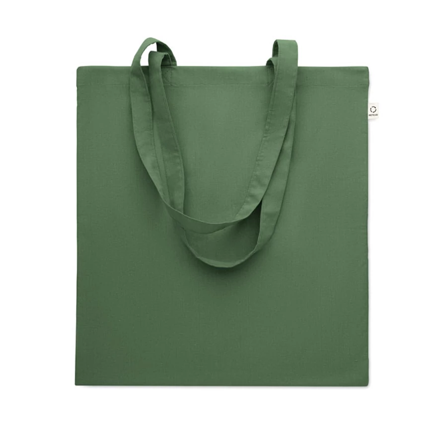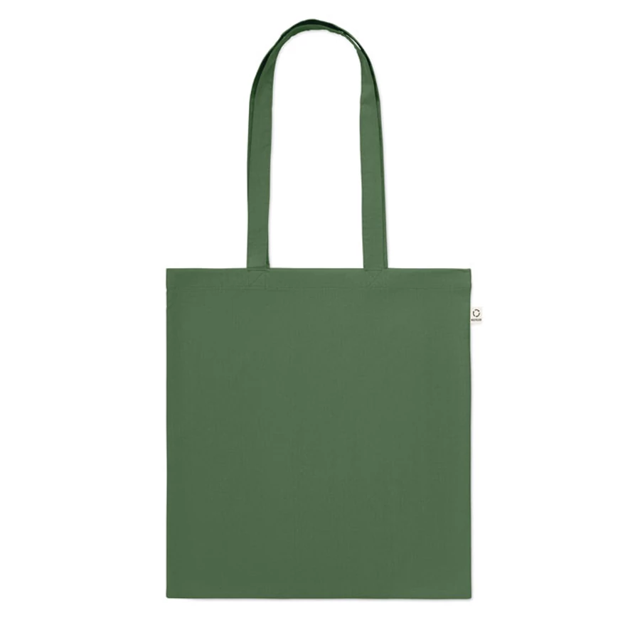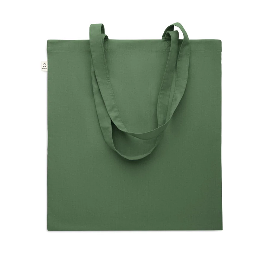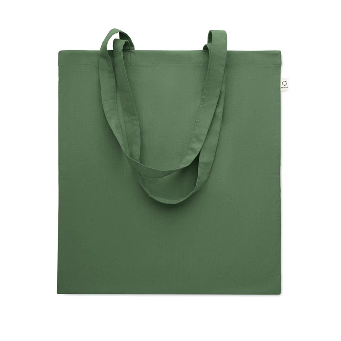 Fogyasztás előtti újrahasznosított pamut bevásárlótáska (70% újrahasznosított pamut és 30% RPET), hosszú fülekkel. 140 g/m². Ez az anyag nyomtatás után zsugorodhat.